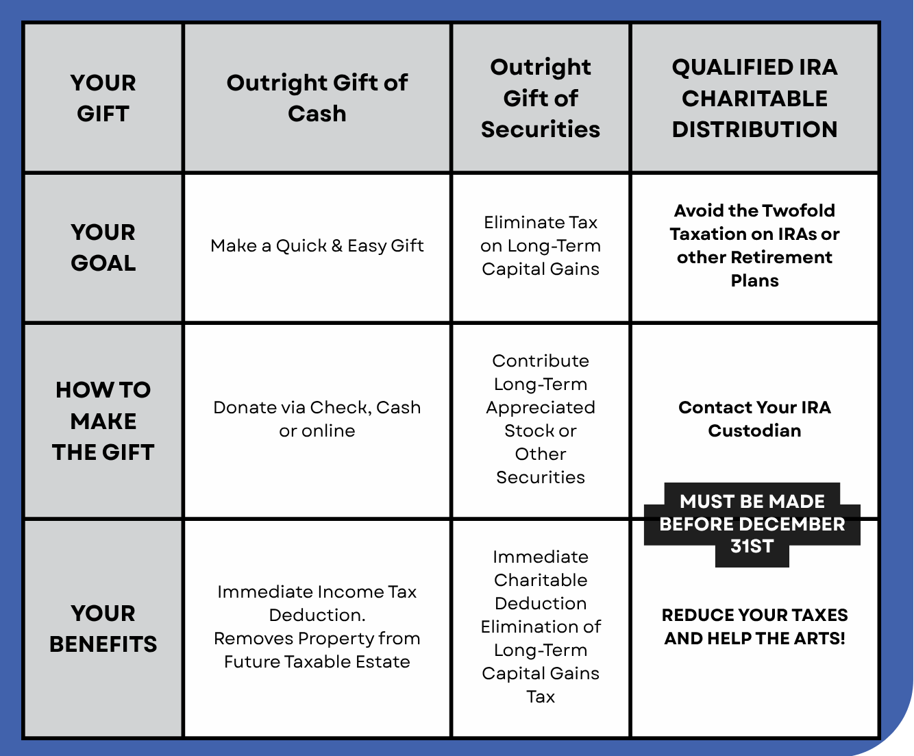 If you’re age 70½ or older, your IRA’s required minimum distribution (RMD) may increase your taxable income—even if you don’t need the funds. A Qualified Charitable Distribution (QCD) lets you transfer up to $105,000 directly to Arts of the Pamlico, potentially lowering your taxable income while fueling our mission. Must be completed by December 31 for the current tax year. (This page is informational and not tax advice; consult your advisor.)