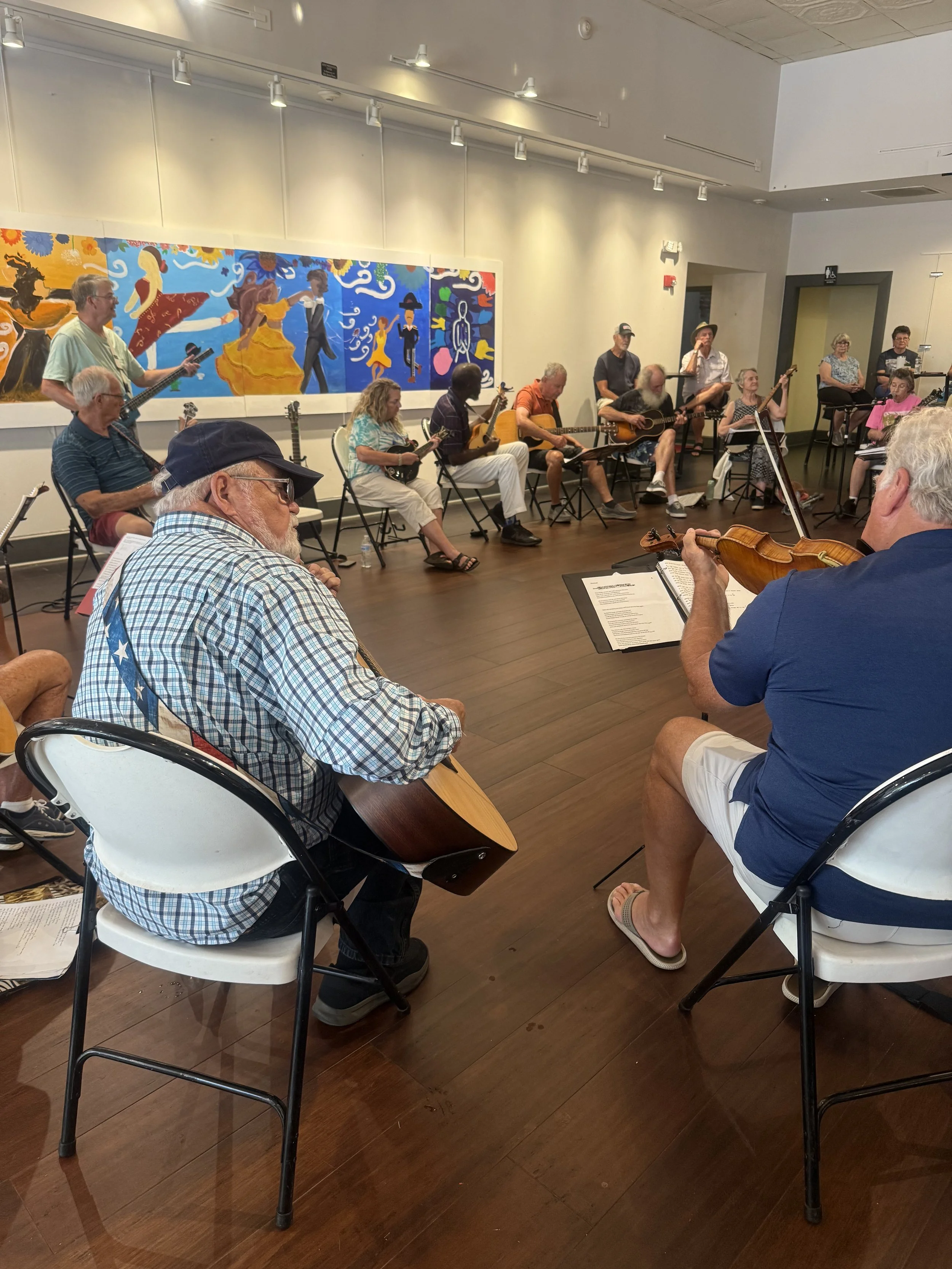 A group of musicians and singers performing in an art gallery with colorful paintings on the wall. The performers include guitar players, a violinist, and a singer, with an audience seated around them.