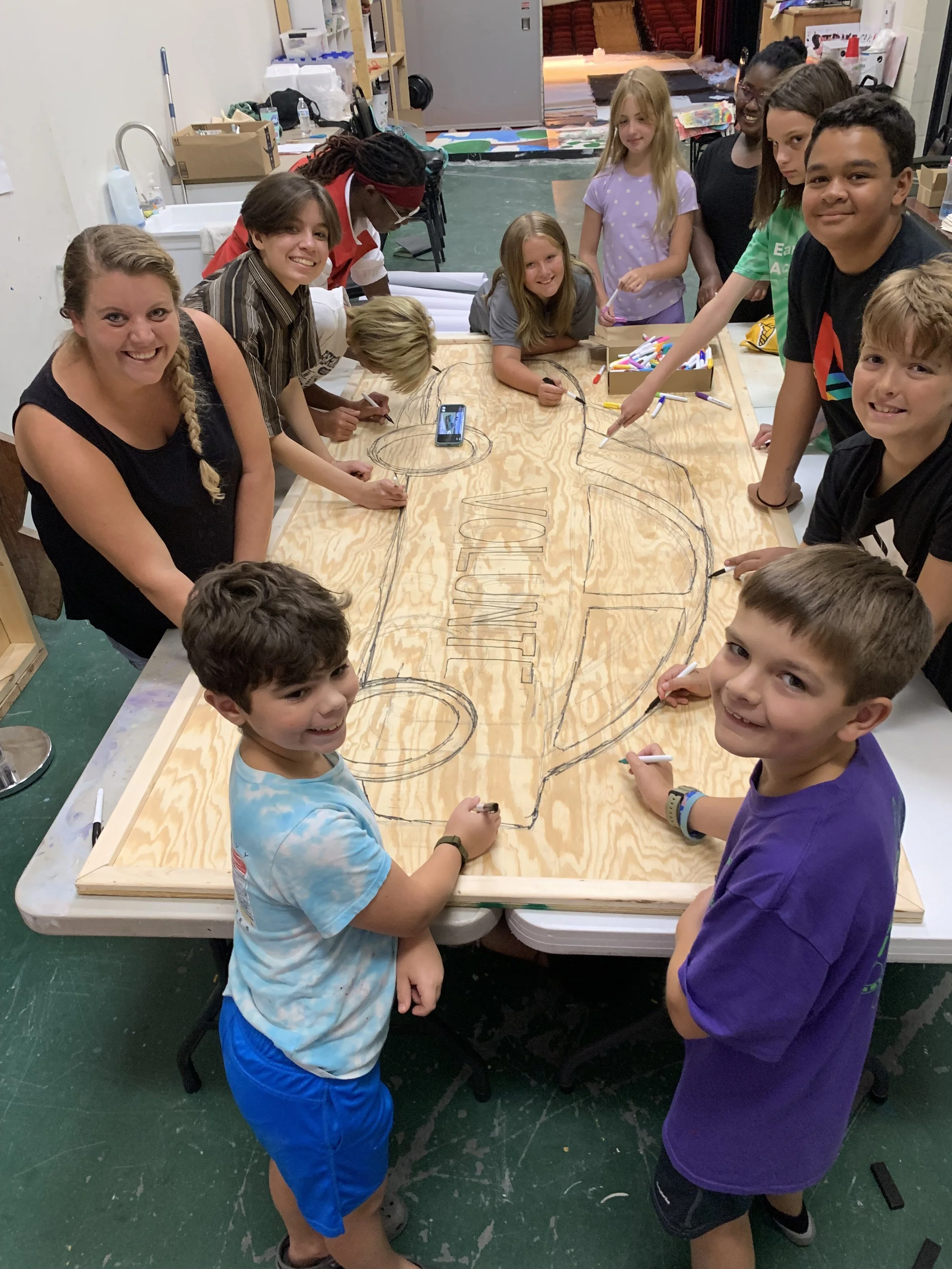 Children and adults gathered around a large wooden table, drawing a large outline of a car with markers in a classroom or studio setting.