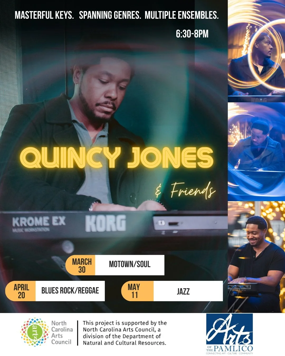 A versatile pianist, vocalist, and multi-instrumentalist, Quincy Jones is known across Eastern North Carolina for his ability to move effortlessly between Great American Songbook jazz standards, soulful originals, and genre-blending influences rooted in jazz, funk, R&B, and pop. Joined by fellow musicians, this evening promises rich melodies, dynamic collaboration, and the kind of musical chemistry that makes live jazz unforgettable.