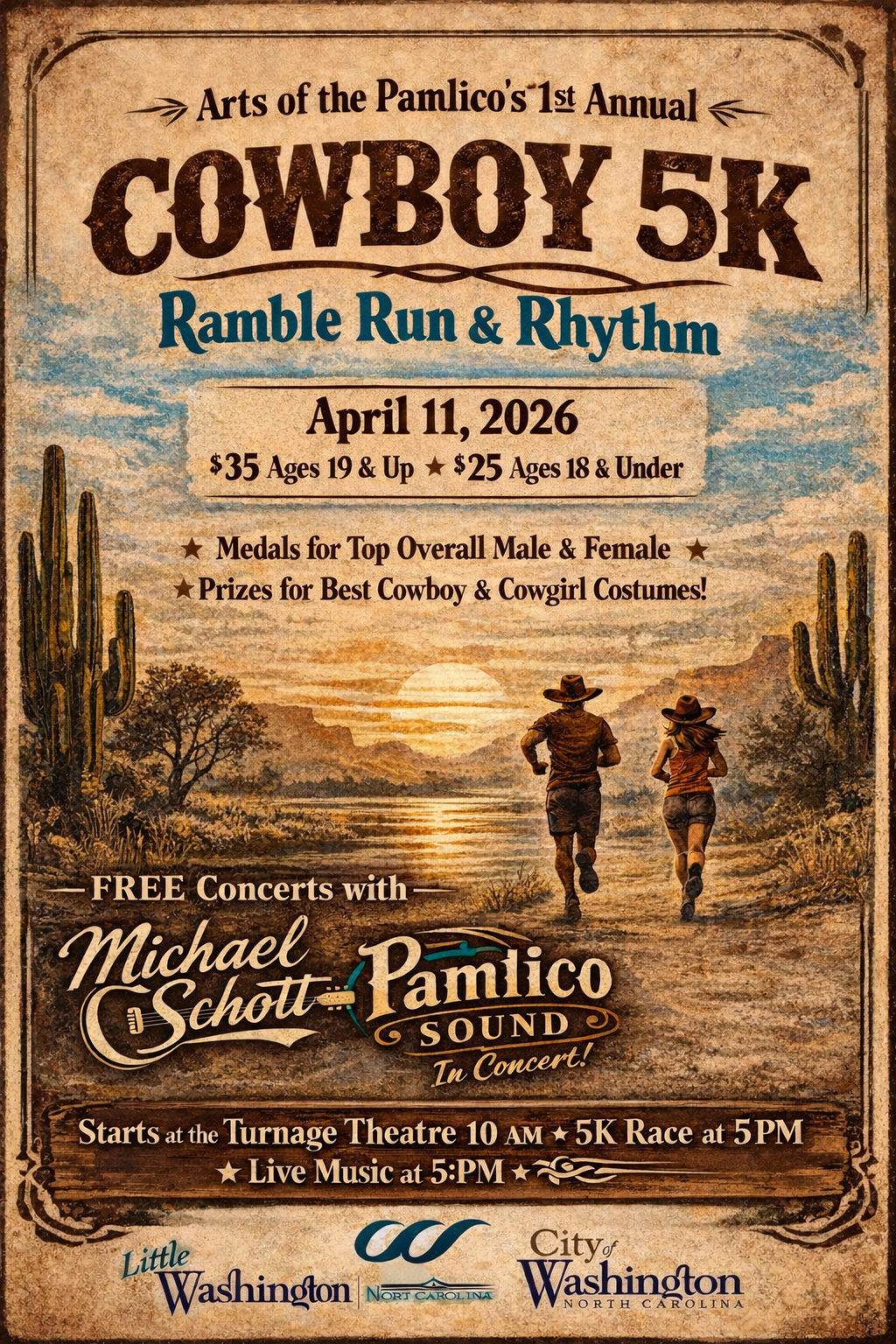 Saddle up for a full-day Western takeover of the Historic Turnage Theatre! From morning movies to a sunset waterfront 5K and a high-energy "Street-to-Gallery" party, we’re bringing the cowboy spirit to the Pamlico.