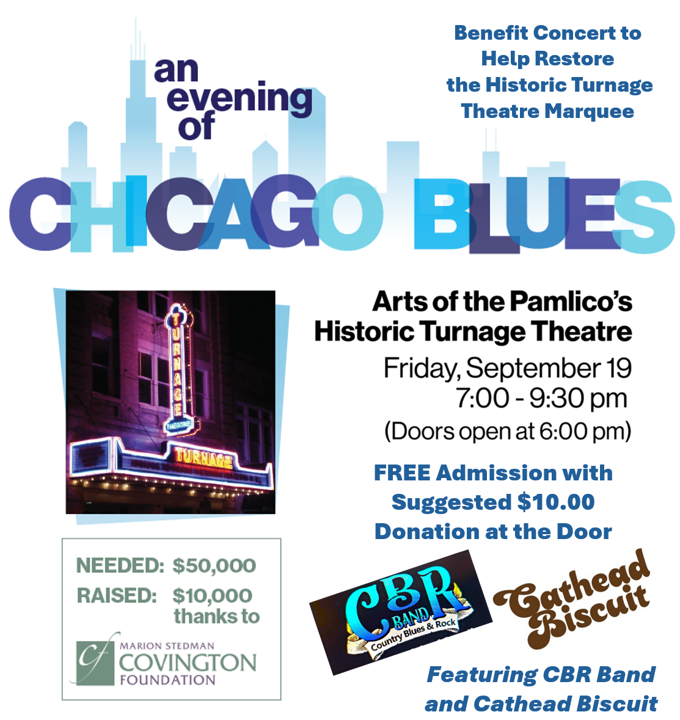 Join us for a night of soulful blues and community support at the Turnage Theatre as we raise funds to replace the aging marquee sign that lights up Main Street in downtown Washington.