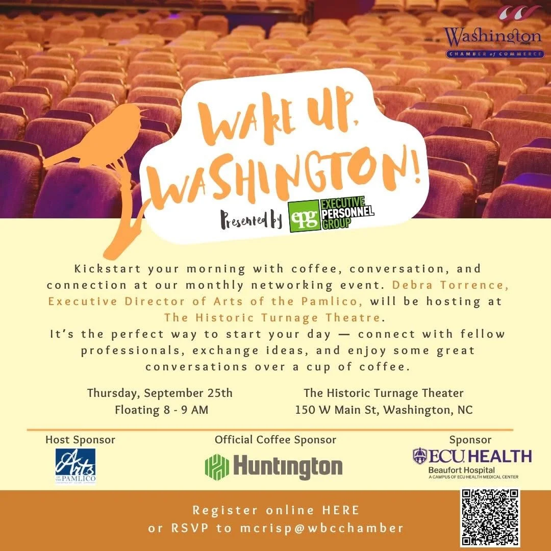 Join the Washington Chamber of Commerce for coffee, conversation, and connection at their Wake up, Washington! networking event. Debra Torrence, Executive Director of Arts of the Pamlico, will be hosting at The Historic Turnage Theatre. Beaufort County Arts Council - Turnage Theatre