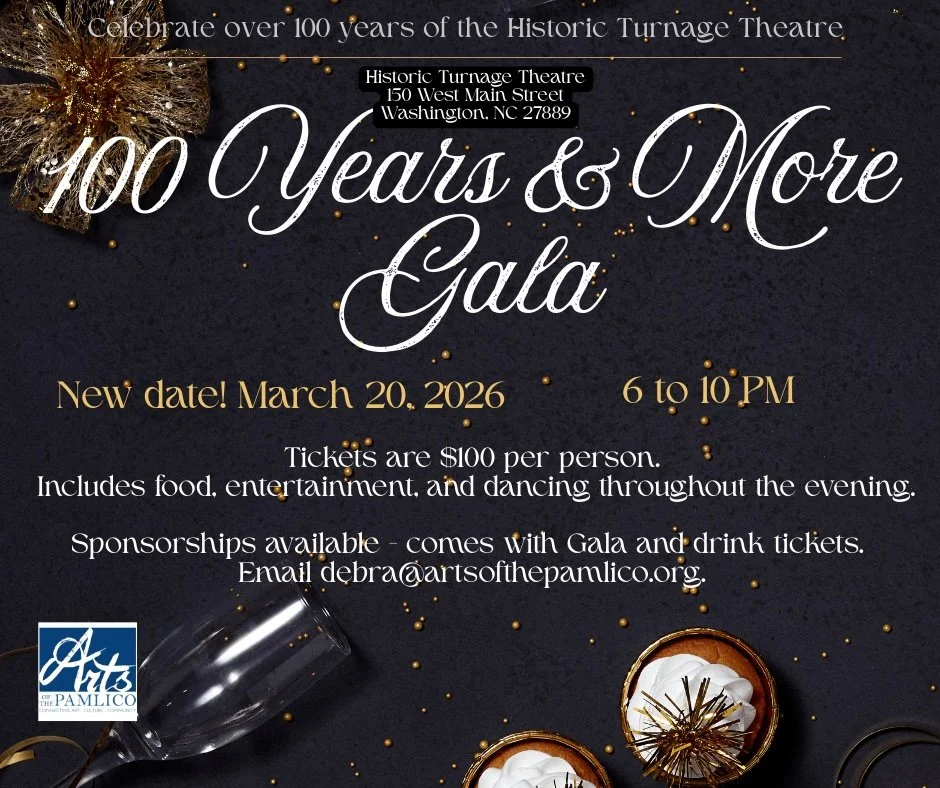 Join us and celebrate over 100 years of arts & culture at the Historic Turnage Theatre with an unforgettable gala evening honoring our past and looking boldly toward the future of the arts in Washington, NC. Ticket holders receive a complimentary beverage or bubbly! Come by the theatre to save processing fees. Open W-F 11 AM - 5 PM and Sat 11 AM - 3 PM.