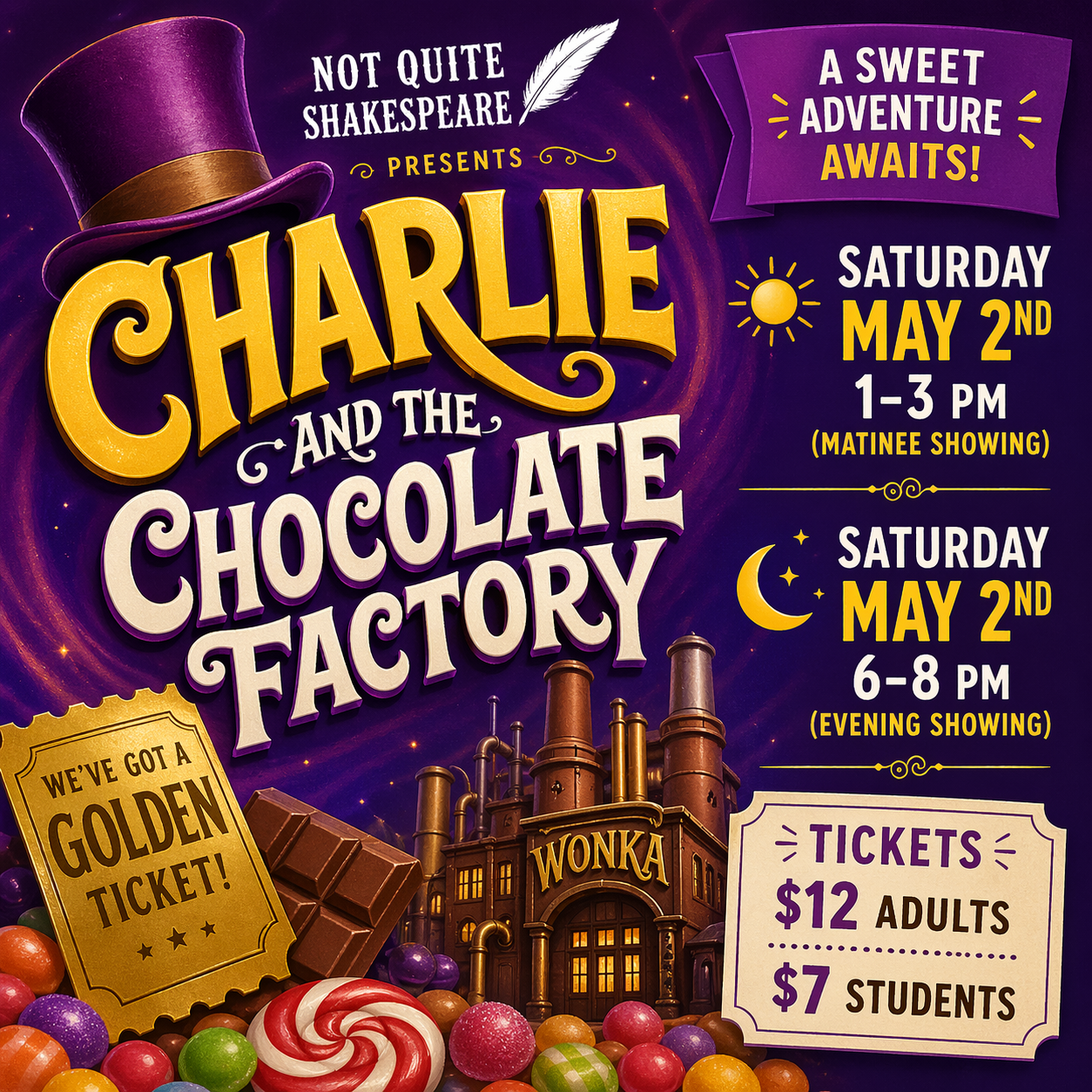 Get ready for a "scrumdiddlyumptious" adventure at the Historic Turnage Theatre! Not Quite Shakespeare youth troupe brings the beloved world of Roald Dahl to life. Follow young Charlie Bucket as he finds a Golden Ticket and embarks on a life-changing tour of Willy Wonka’s mysterious chocolate factory.